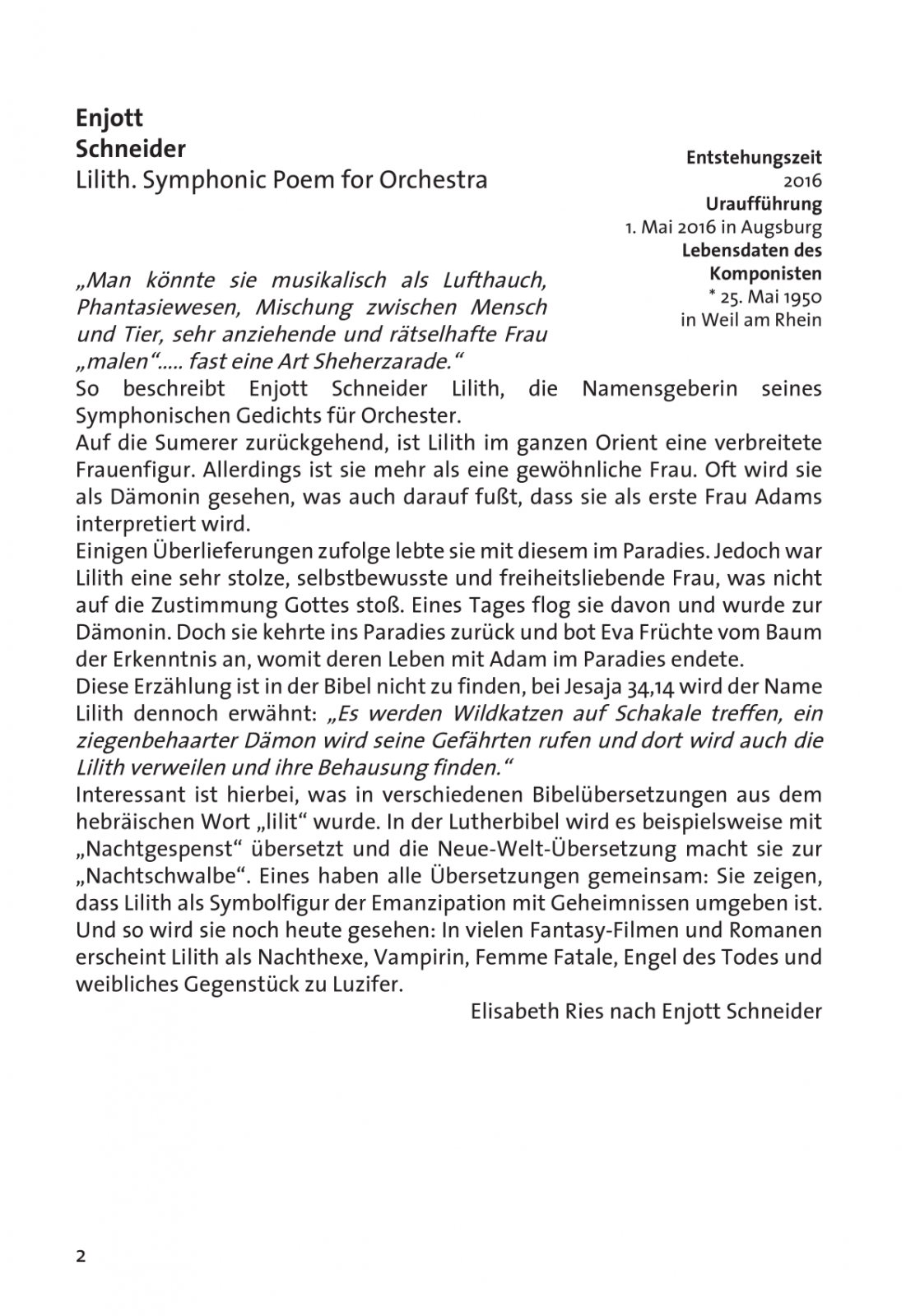 - E. Schneider: Lilith. Symphonic Poem for Orchestra