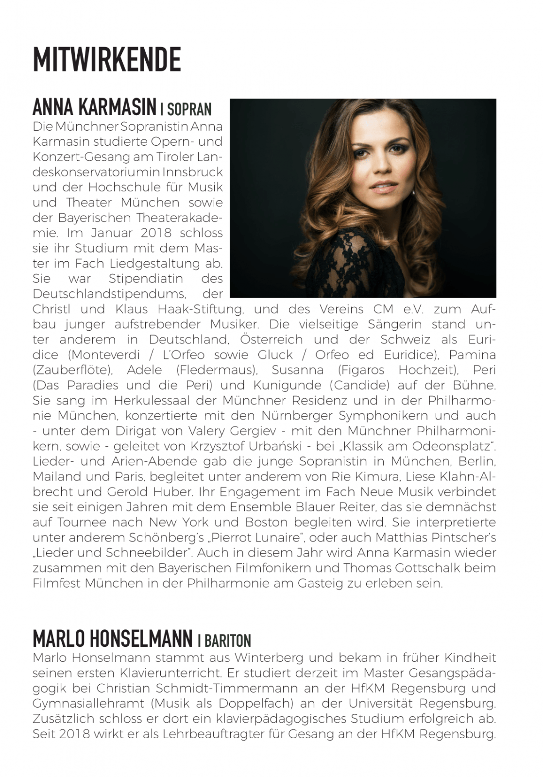 Solisten: Anna Karmasin (Sopran), Marlo Honselmann (Bariton)